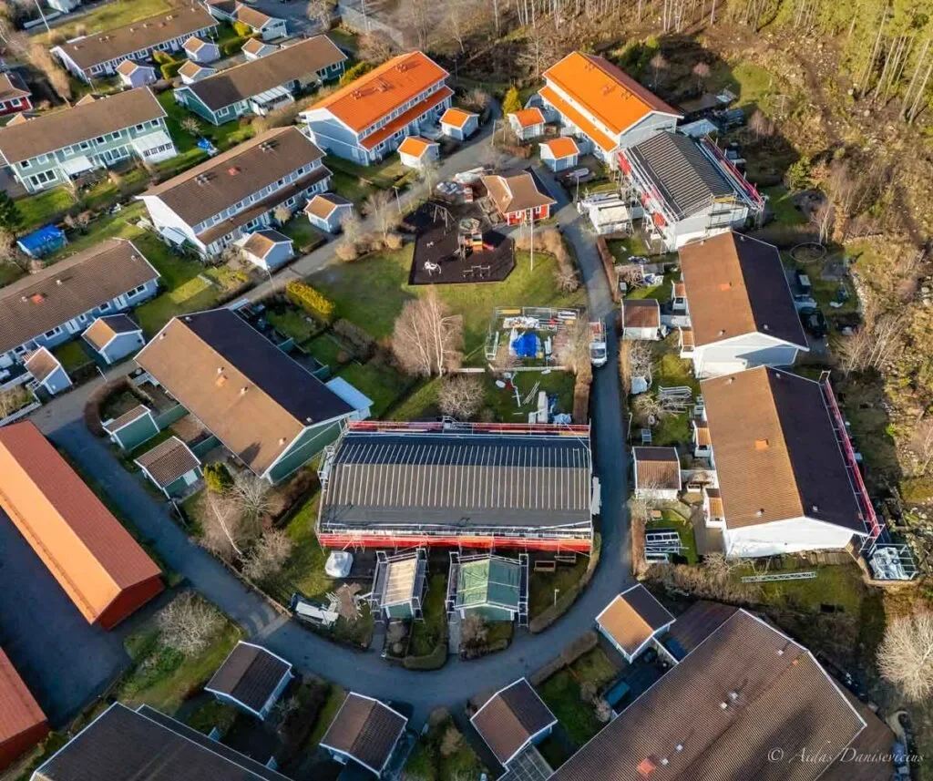 Uppdraget genomfördes inom VLOS i tätbebyggt område enligt A2-krav, med full säkerhetsplanering och dialog med BRF-representant på plats.